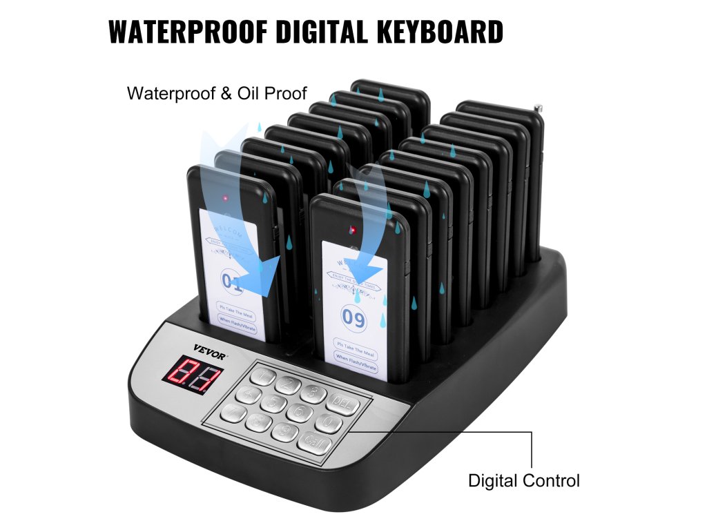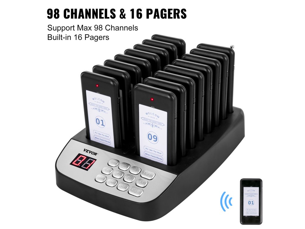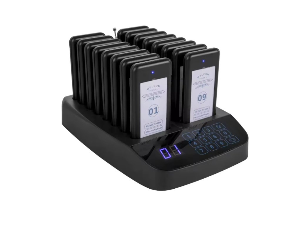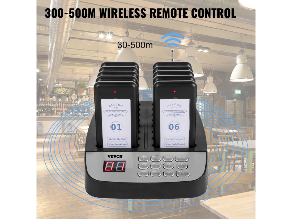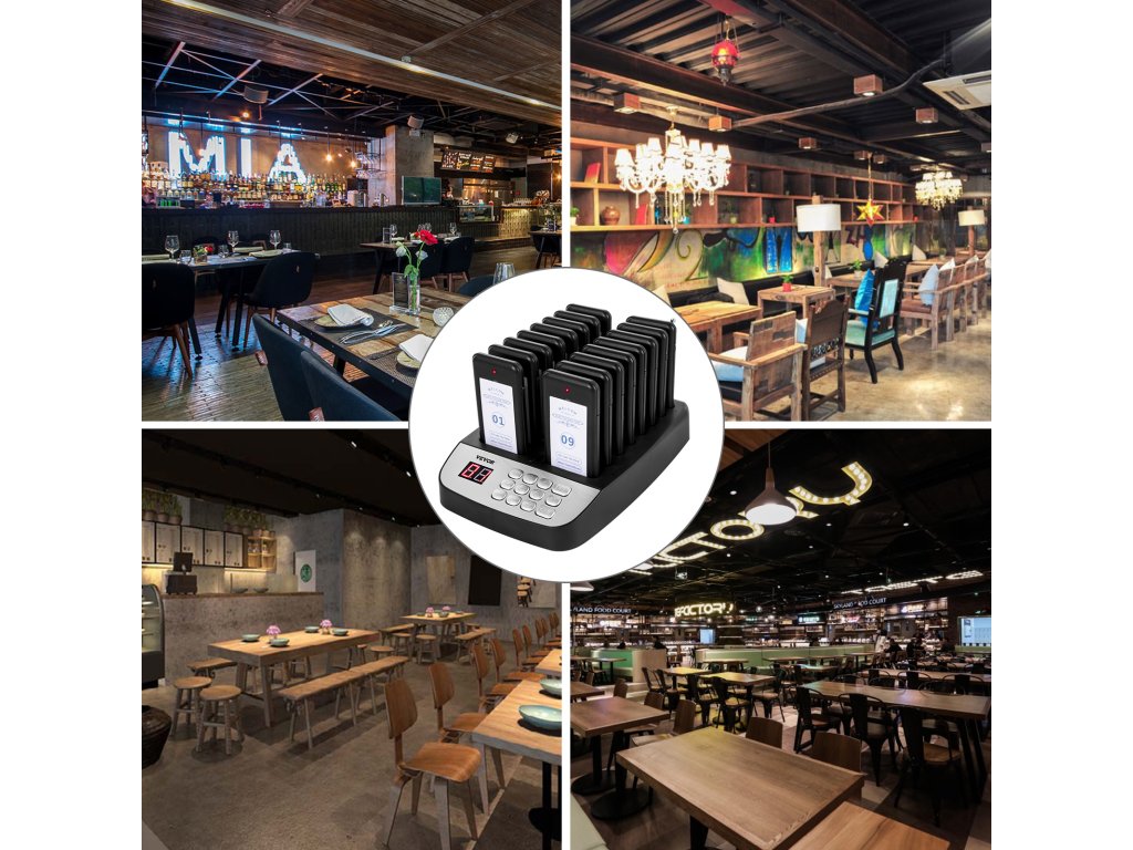 【KIVÁLÓ TELJESÍTMÉNY】 - Az éttermi személyhívó rendszer egy 98 csatornás vezeték nélküli billentyűzetes hívóbázisból és 16 db személyhívóból áll. Lehetővé teszi a személyzeti káosz elkerülését, a társadalmi távolságtartást és a munkahatékonyság javítását.