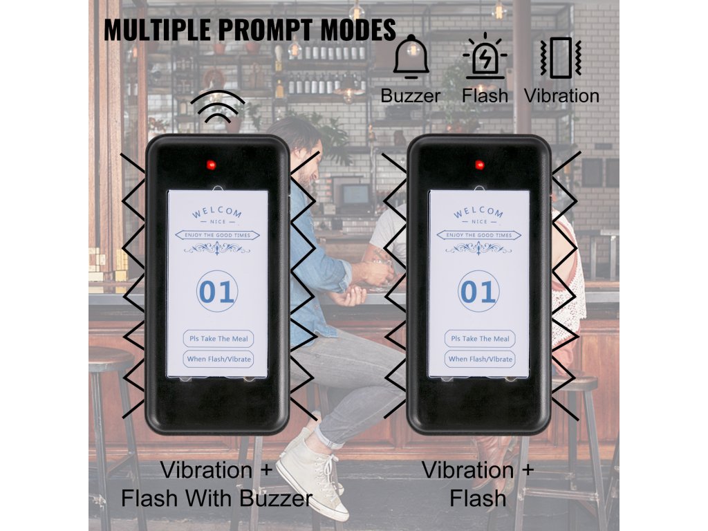 【2 HÍVÁSI MÓD】 - Az éttermi személyhívó rendszer 2 üzemmódja a rezgés + villogás csengővel, valamint a rezgés + villogás, különböző alkalmakkor. Széles körben használják éttermekben, szállodákban, kórházakban és kávézókban.