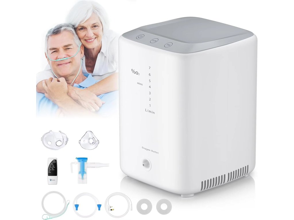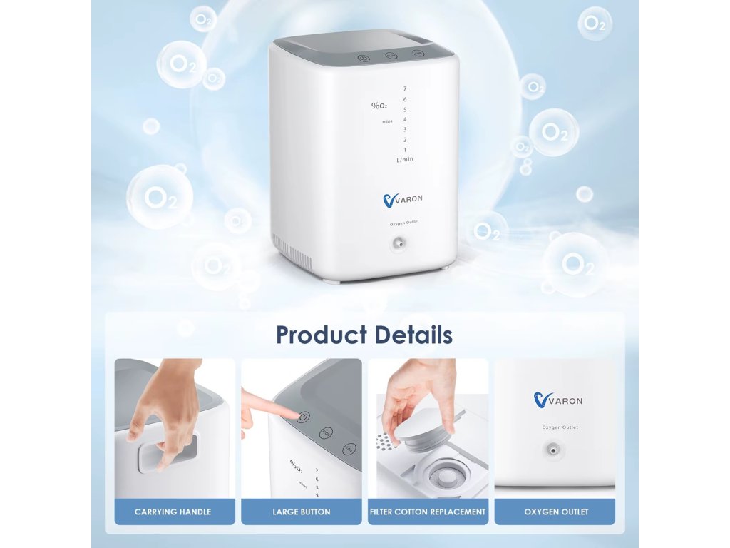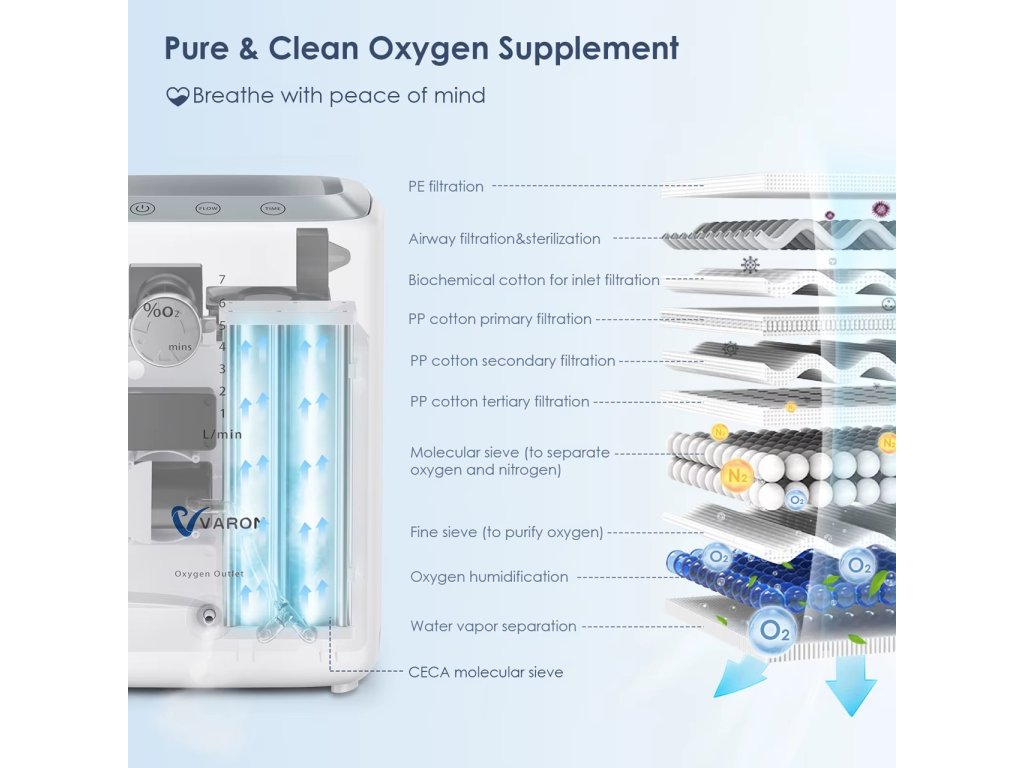 Folyamatos és stabil oxigénbevitel 1 és 7 l/perc között állítható áramlással. A maximális koncentráció eléri a 93±3%-ot. Jelentősen javítja a légzést, és lehetővé teszi a természetes otthoni életet. Porlasztó felülettel felszerelt, egy gép kettős használatra.