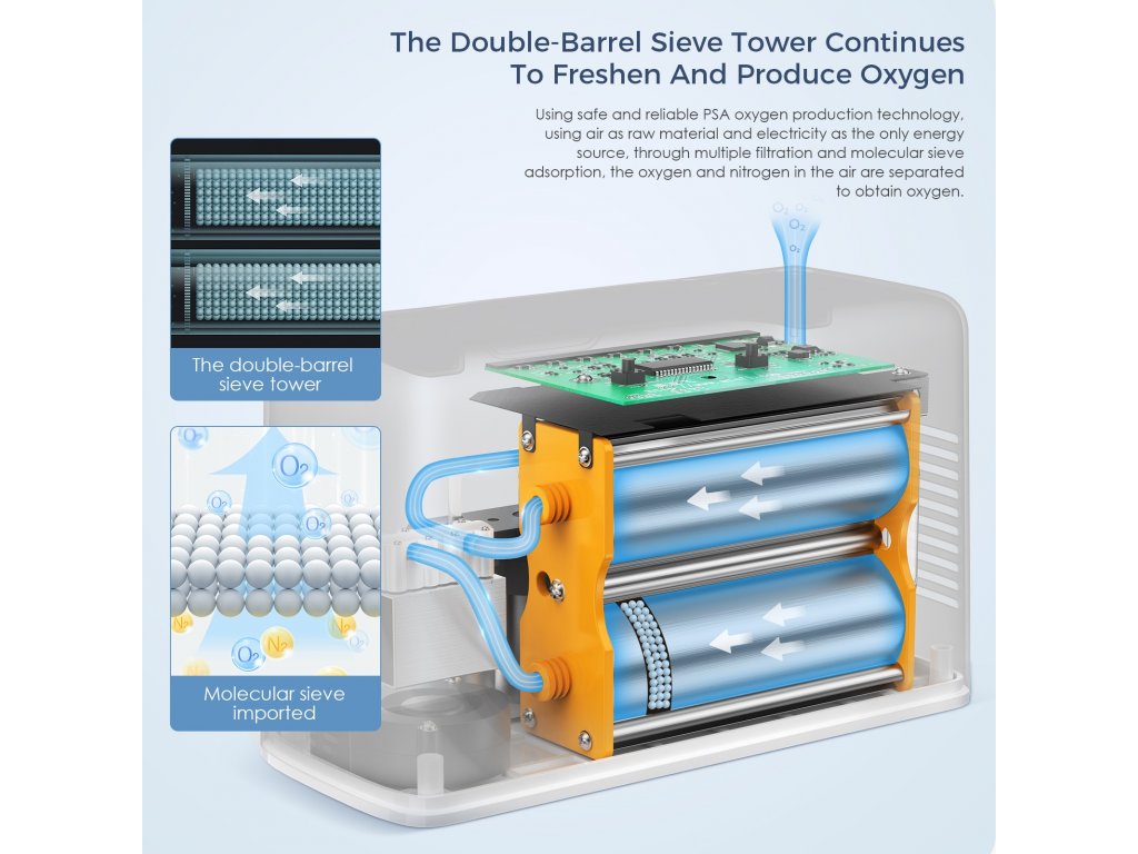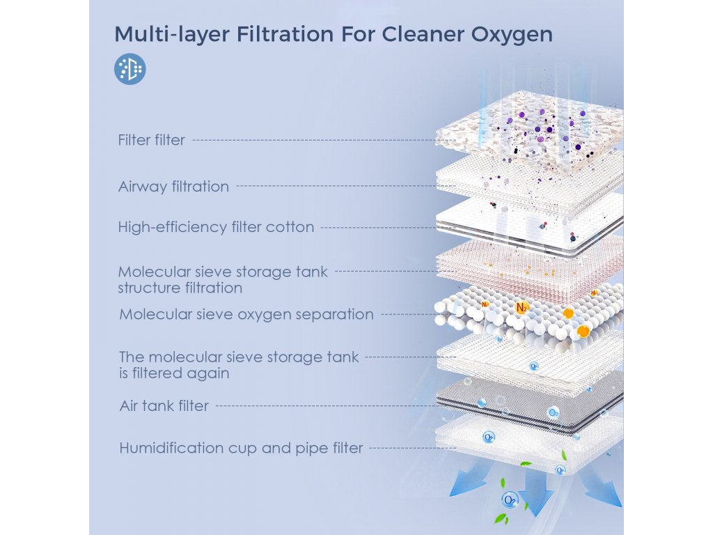 Oxigénkoncentrátorunk stabil 3L/perc áramlást biztosít PSA technológiával, stabil 30,5±2,5%-os koncentrációt biztosítva. Prémium minőségű molekulaszita kiszűri a nem kívánt gázokat, és minden egyes lélegzetet megtisztít a biztonság és a megbízhatóság érdekében. Megjegyzés: Egészségre és kényelemre tervezték, nem orvosi vagy élethosszabbítási célokra.